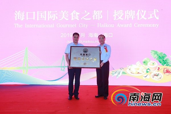 7月19日上午,世界中餐業(yè)聯(lián)合會常務(wù)副會長邢穎(右)代表世界中餐業(yè)聯(lián)合會向海口市頒發(fā)“國際美食之都”的證書和牌匾。南海網(wǎng)記者 任桐攝