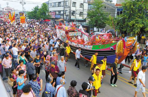 大暑送“大暑船”活動在浙江臺州沿海已有幾百年的歷史。“大暑船”完全按照舊時的三桅帆船縮小比例后建造,長8米、寬2米、重約1.5噸,船內(nèi)載各種祭品。活動開始后,50多名漁民輪流抬著“大暑船”在街道上行進,鼓號喧天,鞭炮齊鳴,街道兩旁站滿祈福人群。“大暑船”最終被運送至碼頭,進行一 系列祈福儀式。隨后,這艘“大暑船”被漁船拉出漁港,然后在大海上點燃,任其沉浮,以此祝福人們五谷豐登,生活安康。