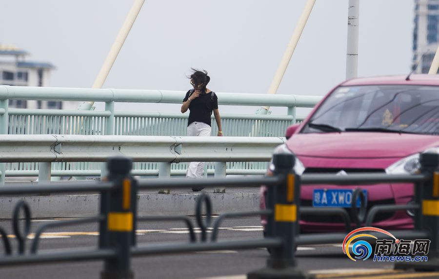 圖為海口世紀大橋上,行人的頭發被大風吹得凌亂。南海網記者 劉洋攝
