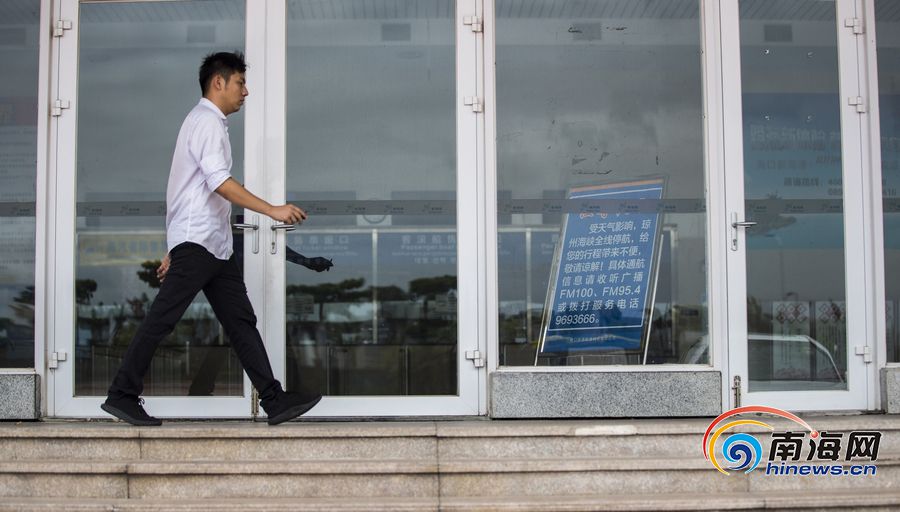 海口新海港工作人員設立停航提示牌,提醒過海旅客。南海網記者 劉洋攝