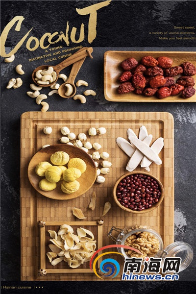 《中國海南菜》裝幀精美,全書銅版紙印刷,封面設(shè)計大氣,寓意深遠(yuǎn)。一個墨綠色大深碗,碗沿有清晰的鋸齒紋,烘托其間盛放的一枚小青椰,它的頂部有根細(xì)細(xì)的枝條,沒用刀切,而是直接扯離主桿,保持茬口新鮮......