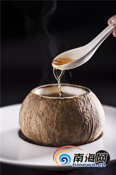 椰子八寶雞湯,選用的椰子十分有講究,要用生長期為180天至200天的海南老椰子,煨出的雞湯才能掛上淡淡的椰香。其間的桂圓干“一定要連殼燉,才不會過于甜膩。”