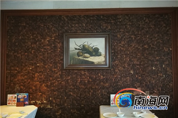 廣州文昌酒店的大堂墻壁裝修別致,這是26年前,文昌手藝人切割椰殼,打磨成一根根細(xì)條,粘貼而成。南海網(wǎng)首席記者 康景林 攝
