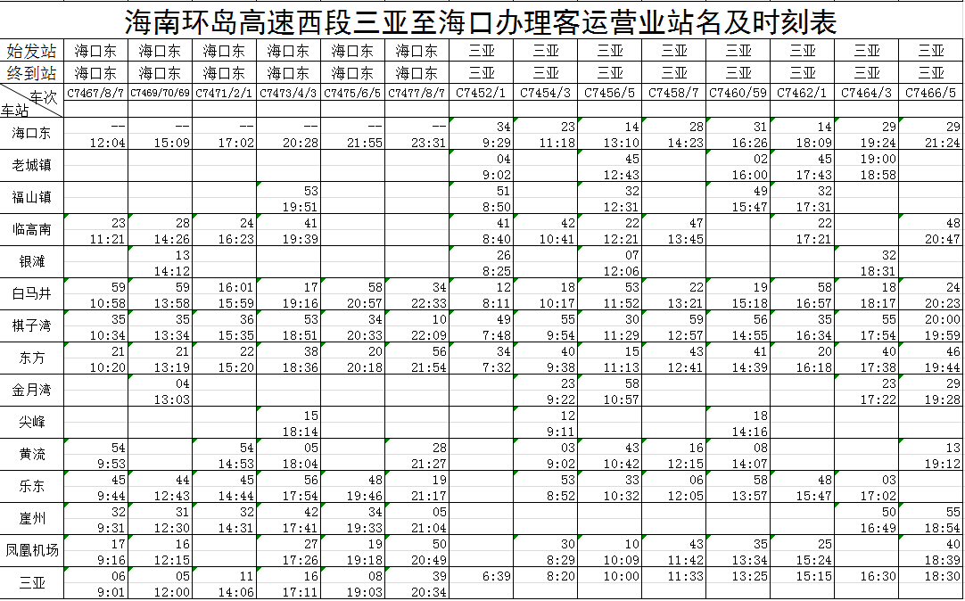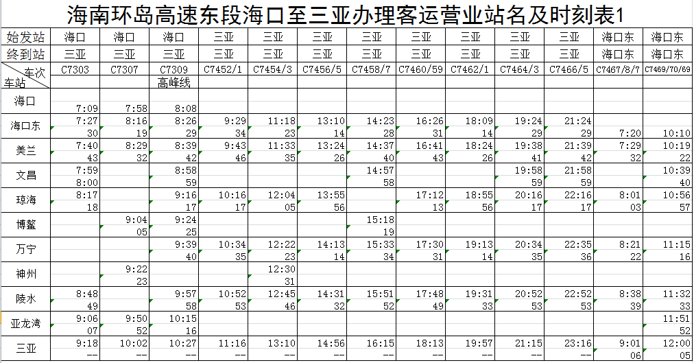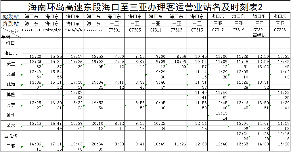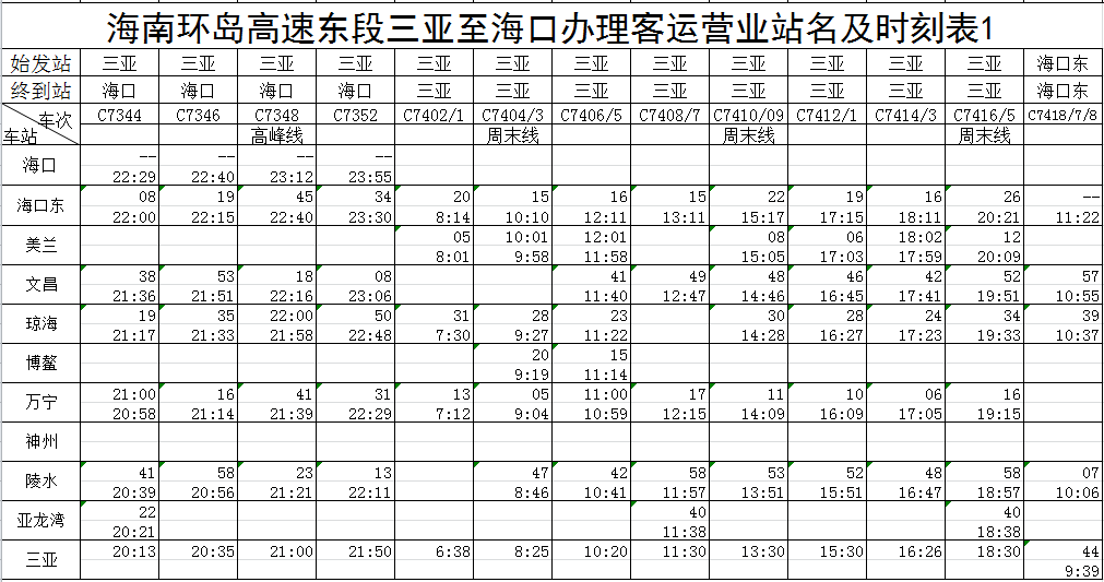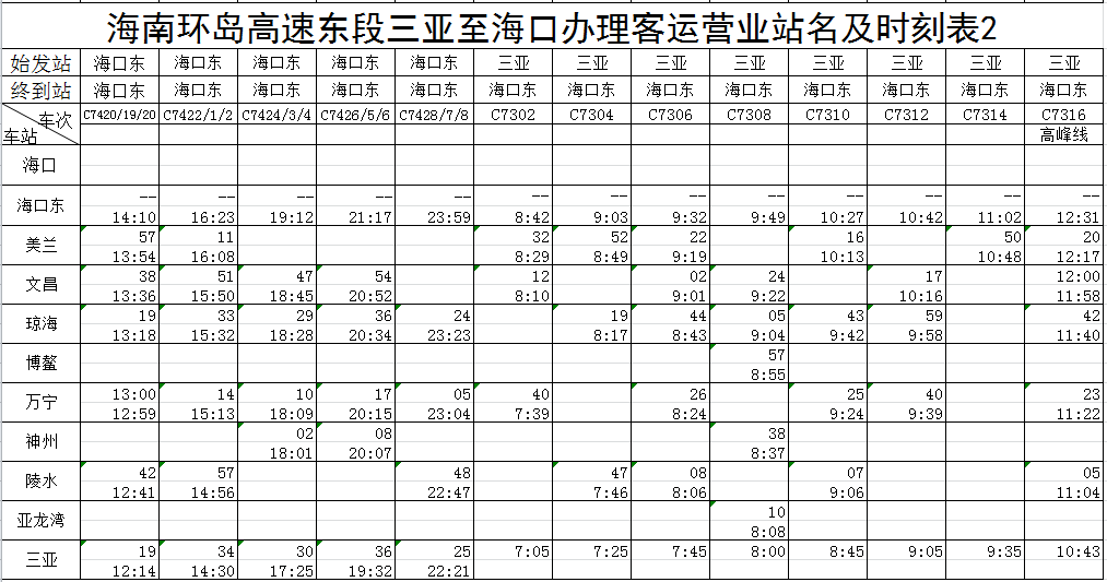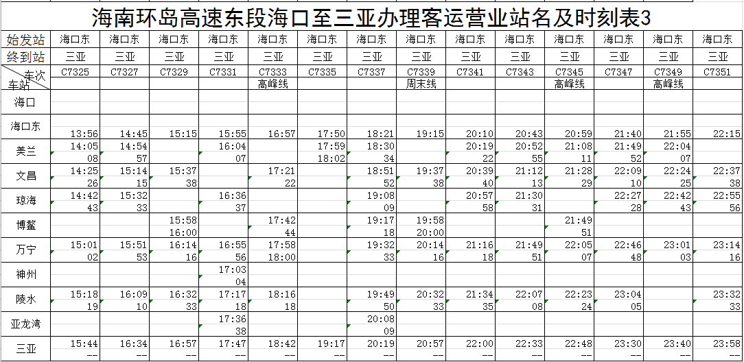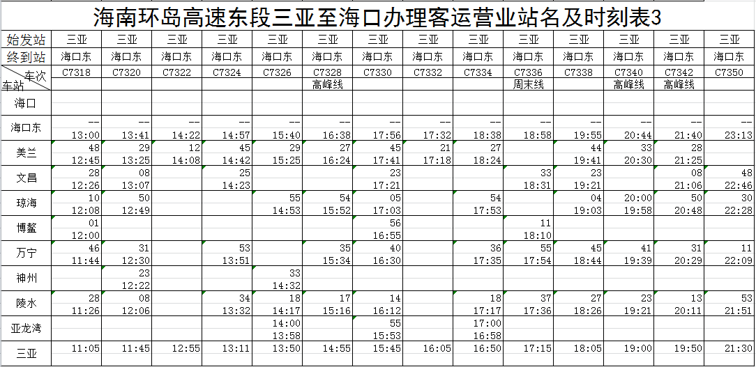 新列車運行圖周一至周四開行“C”字頭動車組列車32.5對,其中環(huán)島高鐵東段本線車20對,三亞-三亞環(huán)島車6.5對、海口東-海口東環(huán)島車6對。周五至周日開行“C”字頭動車組列車35對,其中環(huán)島高鐵東段本線車21對,三亞-三亞環(huán)島車8對、海口東-海口東環(huán)島車6對。