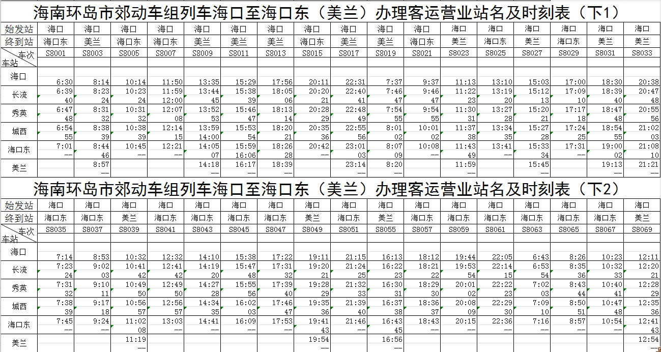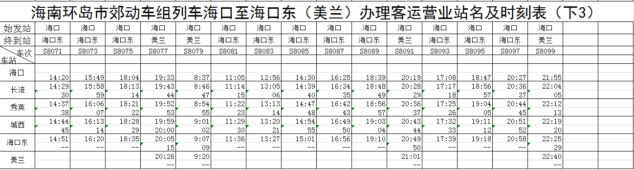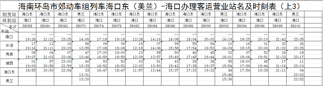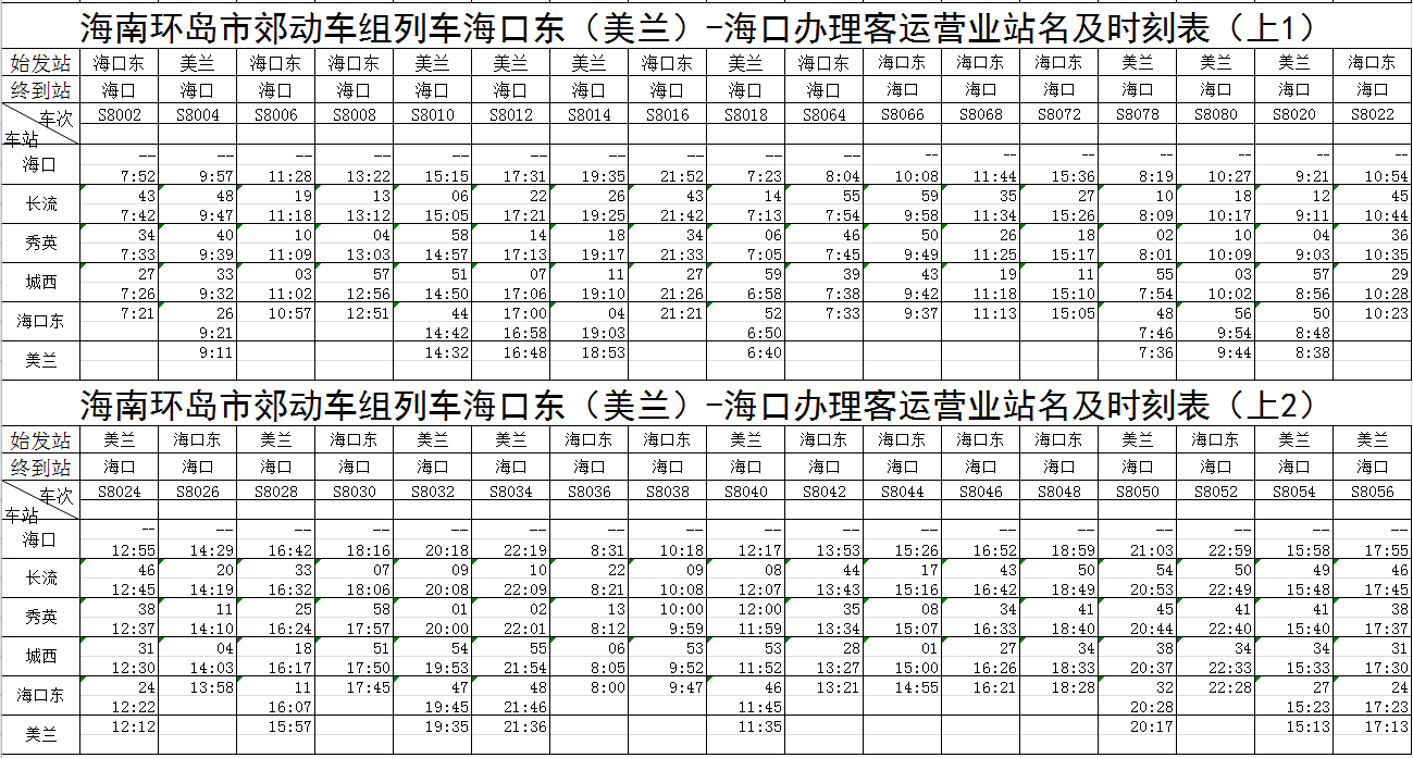 據(jù)介紹,新圖運行后,周一至周四開行“S”字頭市郊列車40.5對,其中海口-海口東26對,海口-美蘭14.5對。周五至周日開行“S”字頭市郊列車49.5對,其中海口-海口東31對,海口-美蘭18.5對。