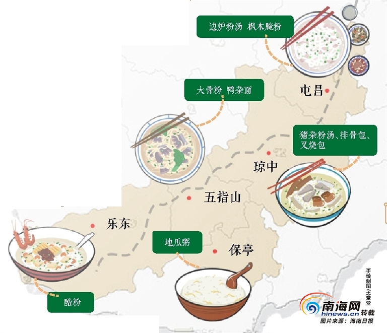 中國飲食里素有“南粉北面”的說法,這點在地處祖國南端的海南更是體現得淋漓盡致,海南各市縣的早餐似乎都離不開一碗粉,腌粉、湯粉、打起邊爐吃粉,海南人吃粉的方式可謂花樣百出,但海南早餐又不僅僅只有粉,溫潤暖胃的粥、濃香軟綿的粽子、醬汁鮮香的包子……在各種食材的碰撞和風味的交匯中,吃出了海納百川的飲食包容性。上期的《旅游周刊》沿著G98高速的東段尋味早餐,這期我們將沿著海南中線高速G9811,走進沿線市縣,去看看海南中部的老字號早餐店都藏著什么風味。 ——編者