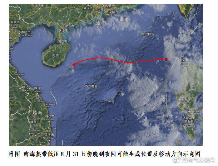 據監測,目前位于巴士海峽附近海面的熱帶云團快速向偏西方向移動,將于今天(8月31日)傍晚到夜間進入南海東部海面,并可能加強為熱帶低壓,低壓生成后將以每小時25公里左右的速度向偏西方向移動,可能于9月1日加強為今年第13號臺風(熱帶風暴級),2日逐漸向海南島東部沿??拷?~5日,該熱帶氣旋仍可能在海南島近?;匦?,將給海南省帶來長時間的風雨天氣。