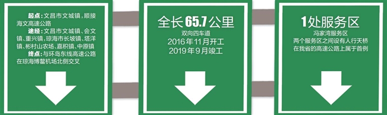 文瓊高速起點位于文昌市文城鎮,順接海文高速公路,經文昌市文城鎮、會文鎮、重興鎮,瓊海市長坡鎮、塔洋鎮、彬村山農場、嘉積鎮、中原鎮,終點與環島東線高速公路在瓊海博鰲機場北側交叉,全長65.7公里。項目于2016年11月開工,它的建成將文昌文城鎮到瓊海博鰲鎮的行車時間從70分鐘縮短至30分鐘。
