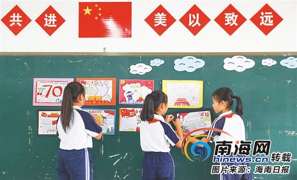 9月25日,海口市第二十五小學(xué)學(xué)生們將國(guó)慶主題的手抄報(bào)貼在黑板上。 海南日?qǐng)?bào)記者 張茂 攝