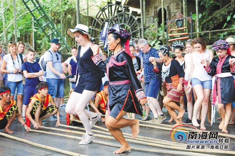 外國游客在檳榔谷景區體驗黎族竹竿舞。
