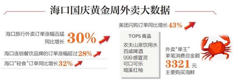 “在海口玩的這幾天,晚飯和夜宵都是靠外賣解決的,點的都是海南當地特色小吃。”從廣州到海口游玩的游客孫先生告訴記者,他不喜歡跟風在景區附近擠來擠去,又不想苦等排隊,這個國慶假期,在酒店點外賣成為他和朋友主要的就餐方式。