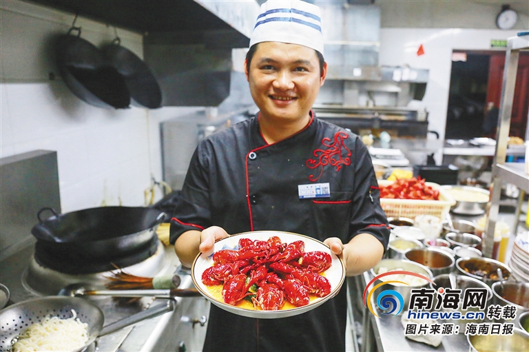 后廚師傅端出炒好的小龍蝦。