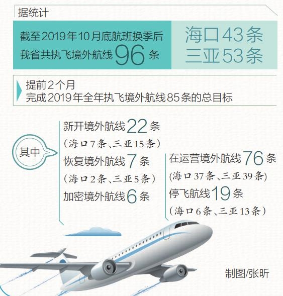 據統計,截至2019年10月底航班換季后我省共執飛境外航線96條,提前2個月完成2019年全年執飛境外航線85條的總目標。
