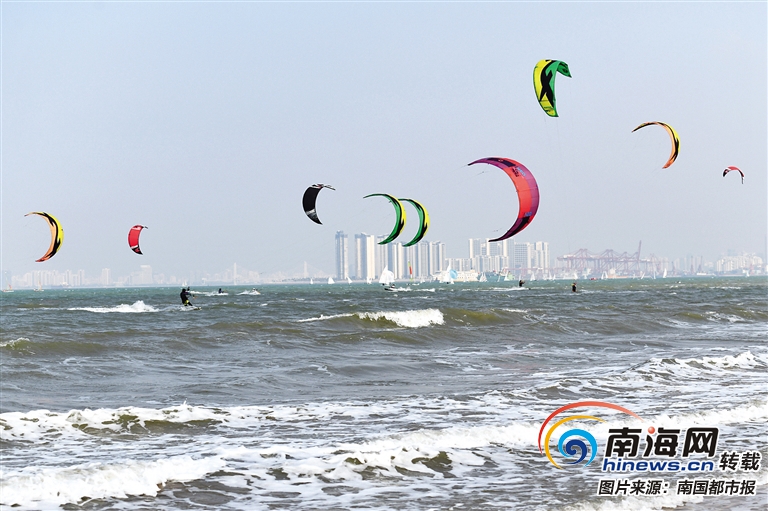 南國都市報11月16日訊(記者 田春宇)2019海南親水運動季風箏沖浪邀請賽16日上午在海口假日海灘開幕,共有來自海南、山東、福建等13個省份約60名風箏沖浪選手參加了本次海上極限運動賽事。