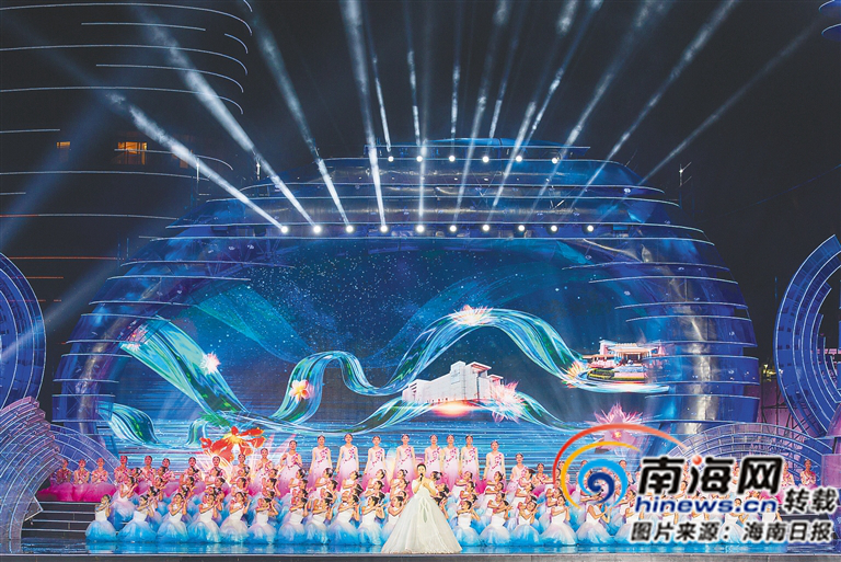 鳳凰島上,五座標(biāo)志性建筑流光幻彩,時(shí)而呈現(xiàn)椰風(fēng)海韻,時(shí)而“綻放”美麗煙花,成為主舞臺的亮眼背景。