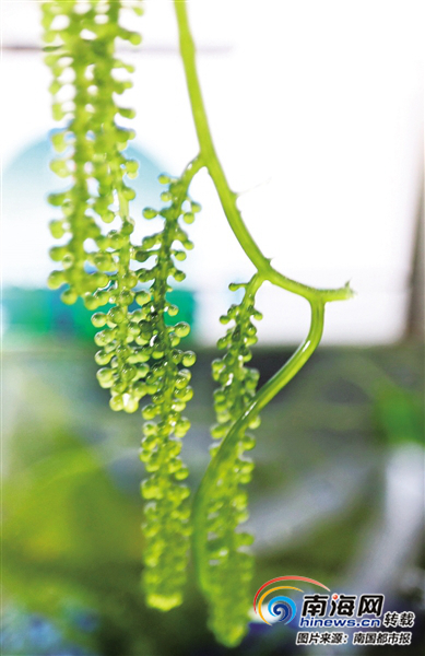 “這一串串綠色的顆粒是什么?”在文昌館內(nèi),不少觀展者圍在一處水缸前發(fā)問。工作人員告訴記者,這種植物名為“海葡萄”,學(xué)名長莖葡萄蕨藻,屬綠藻類,因外觀渾圓飽滿、如一串串晶瑩剔透的葡萄而得名。而這些美麗的綠色小顆粒散發(fā)出海味的咸鮮芳香,頗有魚子醬的神韻,所以被喻為植物中的“綠色魚子醬”。