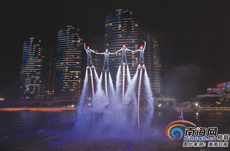 20時許,眾多游艇靜靜泊三亞港的水面上,游艇碼頭外,一個燈光絢麗、形式新穎的舞臺已搭建好在港灣中,舞臺四周散落分布水上發光球,展現出海洋的美妙景色。隨著主持人宣布活動開始,伴隨著富有節奏感的音樂,舞臺背后的水面上,多位“水上飛人”在短時間內完成鯉魚騰躍式地出水、旋轉上升,又急劇下降、轉體360度鉆水等各種高難度動作。