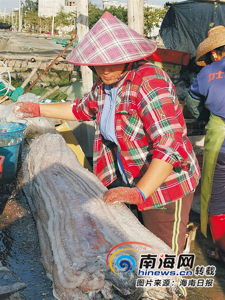 漁民在用鹽腌制鰻魚。海南日報記者 于偉慧 攝