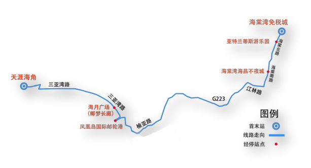 海棠灣免稅城、亞特蘭蒂斯游樂園、海棠灣海昌不夜城、 夏日百貨、三亞游船旅游中心、市委(時代海岸)、解放路步行街、鳳凰島國際郵輪港、海月廣場(椰夢長廊)、美麗新海岸、國光濱海花園、三亞灣假日酒店、天涯海角。