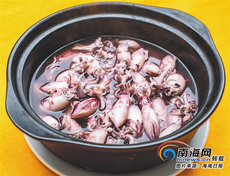 萬寧人有著敢闖敢干的精神,這在萬寧飲食上也有所體現(xiàn)。西餐中的魷魚墨汁飯、墨汁意大利面頗受歡迎,萬寧人也發(fā)現(xiàn)了墨汁的鮮美和營(yíng)養(yǎng)價(jià)值,但烹飪手法是粗獷的、也是大膽的。選用兩個(gè)拇指大小的新鮮魷魚,不去墨汁洗凈后直接入鍋水煮,一鍋烏黑的墨汁湯泡著圓滾飽滿的小魷魚,別看賣相有點(diǎn)嚇人,吃起來可是鮮掉眉毛。
