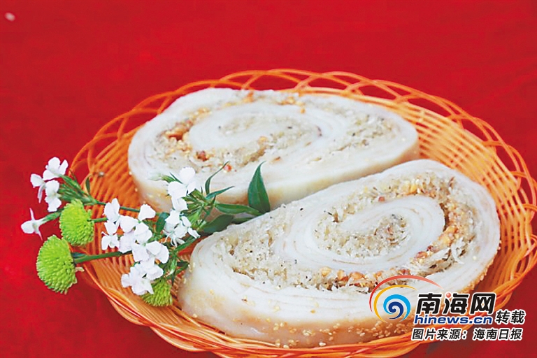 在海南,用糯米與椰子做的各種粿很多,一條就有一米多長(zhǎng)、重量超過15斤、形似豬腸的萬寧豬腸粑在其中可謂霸氣側(cè)漏。萬城鎮(zhèn)北門村的豬腸粑是當(dāng)?shù)厝苏J(rèn)可的正宗貨。運(yùn)氣好的話,上午7時(shí)許,在萬城鎮(zhèn)紅專東路與解放路的交界路口,會(huì)碰到北門村的嚴(yán)家興老師傅推著自行車,在這里售賣剛出爐的豬腸粑。橫切出一塊豬腸粑,白糖煮過的椰絲油亮晶瑩,炒熟的花生米和芝麻被層層白而柔軟的糍粑緊緊包裹,咬上一口,糯米和椰絲的香味,立即就能讓你口舌生津。