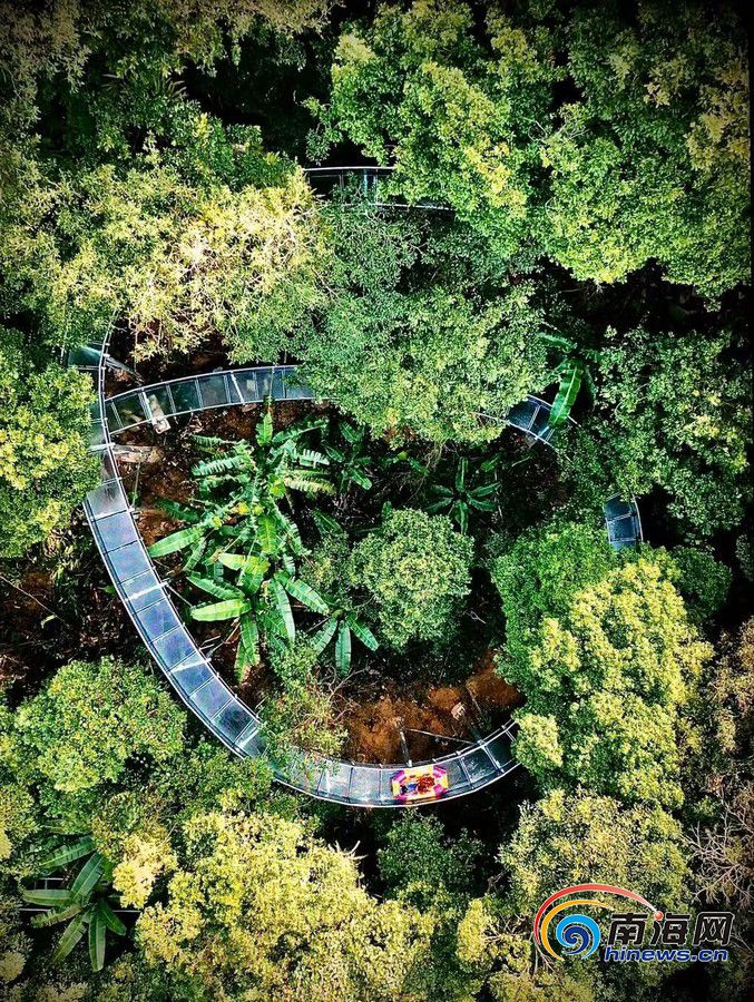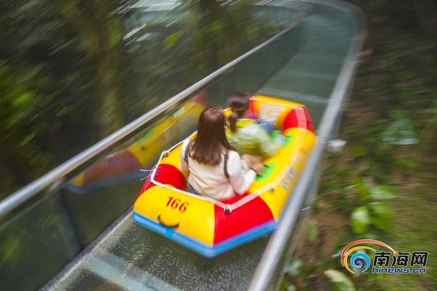 據了解,瓊中百花嶺熱帶雨林高空漂流項目全長2020米,落差約百丈,設有4處360度的雙層環形盤旋、15處S形彎道和一處9D恐龍主題聲光電秀,透明無邊的全視野設計,不僅可以讓游客體驗到高空呼嘯而過的快感,還能換一種角度欣賞到熱帶雨林的獨特魅力。滑道全程采用8cm特制鋼化玻璃,低水位設計讓水流和船體自然分離,顛覆傳統河道漂流模式,可實現漂流不濕身。