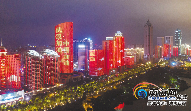 新冠肺炎疫情牽動著每一位中國人的心。2月8日,正值元宵佳節,海口、三亞一些街道的樓體上亮起主題燈光,為武漢加油,為中國加油!圖為2月8日晚,海口市濱海大道點亮主題燈光。海報集團全媒體中心記者 陳若龍 攝