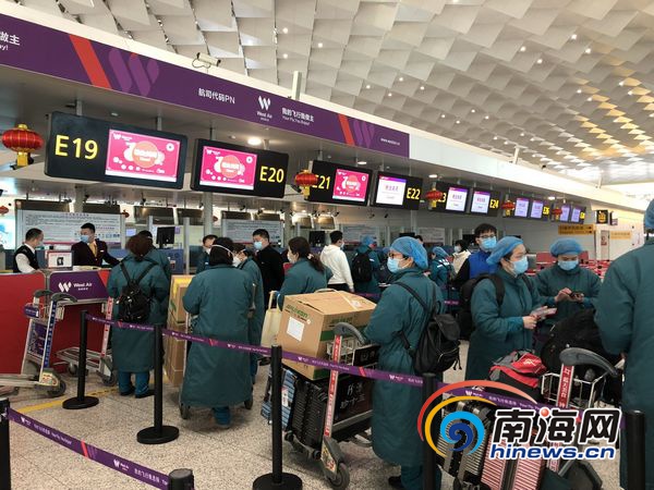 2月15日,西部航空包機(jī)護(hù)送河南省105名醫(yī)護(hù)人員馳援武漢,一線空勤人員為醫(yī)療隊(duì)開通綠色通道辦理值機(jī)。海航供圖