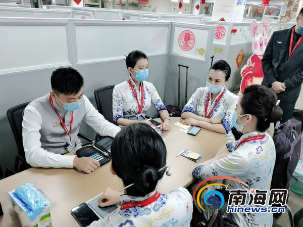 HU5375包機(jī)航班航前準(zhǔn)備會(huì),黨員及乘務(wù)長(zhǎng)宋金鲆與組員們對(duì)客艙保障進(jìn)行逐項(xiàng)確認(rèn)。海航供圖