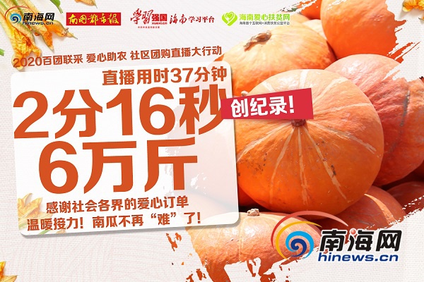 南海網(wǎng)、南海網(wǎng)客戶端、南國都市報海口2月29日消息(記者杜倬荷)2月29日上午,由南海網(wǎng)、南國都市報、海南愛心扶貧網(wǎng)聯(lián)合舉辦“百團(tuán)聯(lián)采愛心助農(nóng)”社區(qū)團(tuán)購直播大行動。經(jīng)統(tǒng)計,直播互動時長為37分鐘,各社區(qū)團(tuán)長下單僅用2分16秒,總計59605斤南瓜被預(yù)訂。