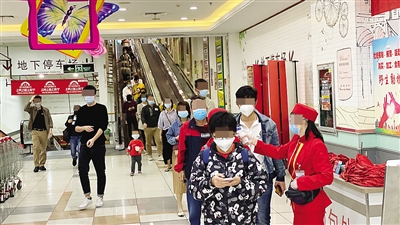 記者走訪發現,市民戴口罩進入超市和商場前,都需要出示健康碼,經工作人員測量體溫為正常后才能進入。3月4日14時許,在明珠廣場旺豪超市門口,記者看到不少工作人員正在教一些老人如何出示健康碼。前去大潤發龍昆南店購物的市民,在門口排起長隊有序進場。超市內蔬菜、水果、肉類較為充足,不少市民在肉類區選購。
