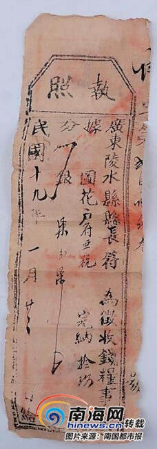 3月16日,記者走訪陵水博物館,看到該館收藏的三張民國時期收糧票據,在其中的一張“執照”上可以看到,上面寫著“廣東陵水縣縣長黃,為征收錢糧事今據?!薄盎☉簦悍麃喍?,完納。”并標注稅款的金額和納稅的時間。執照上的文字不多,是一張繁體字印刷的小紙條,其中戶名和日期等信息為手寫,最晚的一張為民國十九年(1930年)一月。“當時陵水5萬多畝稻田,多半被地主占據,大部分農民被迫淪為游民和佃戶,租種地主土地,除繳交‘押田金’、‘牛腳金’、‘書田金’外,還要負擔20多種苛捐雜稅。”陵水博物館館長陳奮飛介紹,人們的生活長期受到壓迫,這幾張稅收應是同一位農民在三年里繳納的稅款。