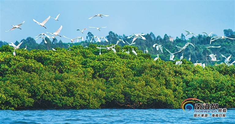 近日,臨高縣彩橋紅樹林保護區,成群白鷺棲息飛舞。
