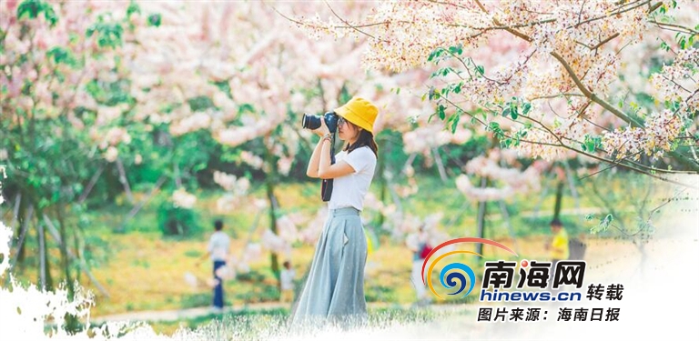 3月27日,儋州市蘭洋鎮藍洋櫻花莊園櫻花綻放,吸引不少游客前來“打卡”。 海報集團全媒體中心記者 陳若龍 攝