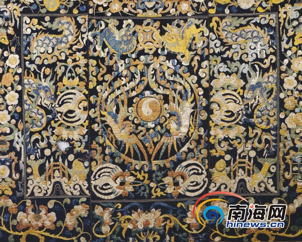 雙鳳日月增輝圖龍被(清中期,海南省博物館藏)通長195厘米,寬122厘米。三幅連綴而成,手工織繡,中間是主體花紋圖案,被分割為兩部分?;y圖案用黃、綠、褐、紅、白等彩線繡成?!皡d”字連續紋帶組成長方形方框把圖案分割為主體花紋和襯托花紋,方框內中間為雙鳳相向太陽和白兔,白兔嘴叼一支桂花象征月亮。雙鳳兩側為相向的雙龍,底下為波濤洶涌的水面,上有龍門和跳起兩條大鯉魚,雙鳳、雙龍、雙魚同朝向日月。框外輔有花瓶內插著梅花、怒放的牡丹和荷花等花卉,在梅花上還有喜鵲落在梅枝上,整幅龍被構圖飽滿,色彩搭配和諧,龍的造型比較矯健,龍鼻大小適當。
