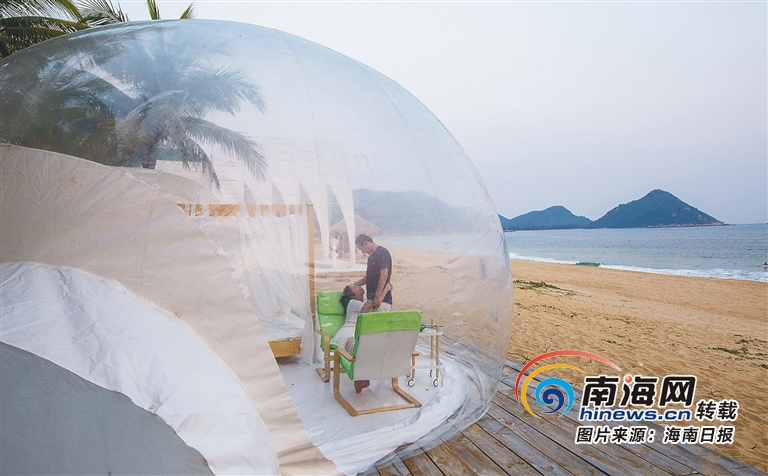 游客在陵水南灣猴島生態旅游區二期項目呆呆島的泡泡屋中拍攝寫真。 武昊 攝