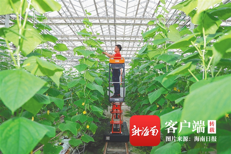 桂林洋國家熱帶農業公園,工作人員在全自動采摘平臺車上查看瓜藤。 海南日報記者 李天平 攝