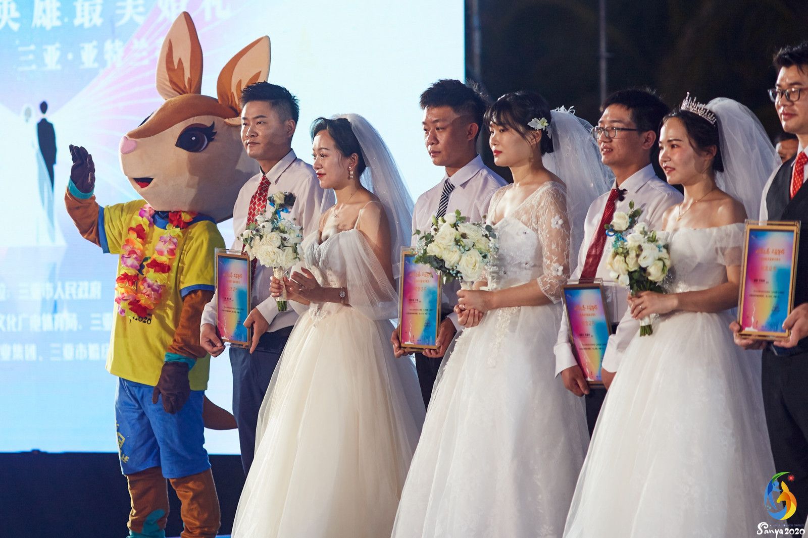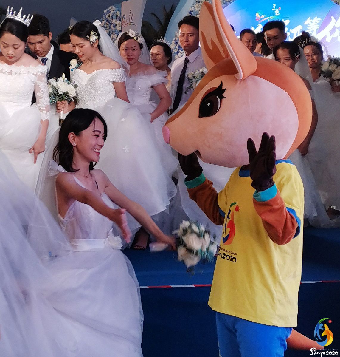 6月6日,“山河無恙三亞等你”全國戰(zhàn)疫英雄最美婚禮在三亞亞特蘭蒂斯舉行,來自全國15個省份的百對戰(zhàn)疫英雄新人攜手許下愛的諾言。活動當(dāng)天,2020年第六屆亞洲沙灘運(yùn)動會(以下簡稱“亞沙會”)吉祥物“亞亞”成為“證婚使者”,見證百對新人執(zhí)手天涯盟誓。