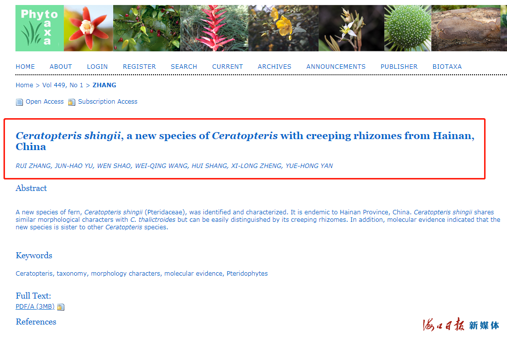 近日,上海辰山植物園(中國科學院上海辰山植物科學研究中心)蕨類植物多樣性和進化研究組,聯合中國醫學科學院藥用植物研究所海南分所研究人員,在國際著名學術期刊Phytotaxa上發表中國水蕨屬橫走莖新物種——邢氏水蕨。據了解,該研究工作得到海口市林業局和??谑袧竦乇Wo管理工作的大力支持和資助。