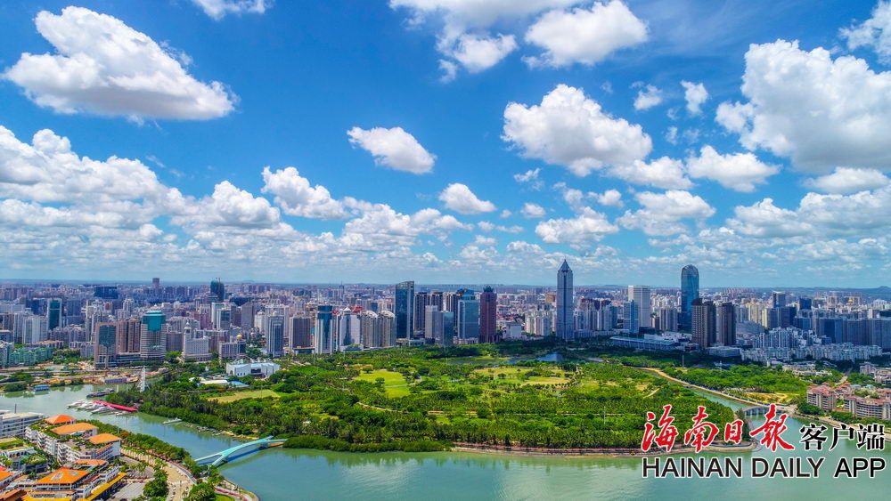 在藍天白云下,海南日報記者高空航拍夏日里海口萬綠園一帶景色,海口“藍”美景盡收眼底。