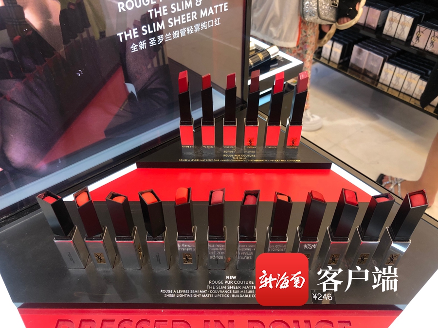 5日上午,記者在海口日月廣場免稅店看到,許多美妝店內人流涌動,不少消費者正在選購口紅。記者對比了幾個口紅的專柜,一只YSL(圣羅蘭)的細管純口紅,免稅價格為246元,而天貓官方旗艦店的價格為335元;阿瑪尼摯愛唇膏免稅價格為227元,天貓官方旗艦店價格為320元;MAC(魅可)的一只啞光唇膏免稅價格僅售88元,而官網價格為175元,差價近一倍;一只Tom Ford的烈焰幻魅唇膏免稅價為329元,官網的價格為450元,差價達到121元。