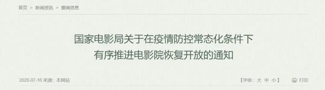 7月16日,國家電影局發(fā)布關于在疫情防控常態(tài)化條件下有序推進電影院恢復開放的通知。