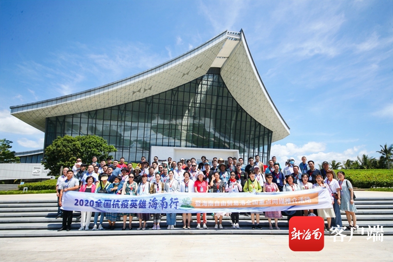 7月26日上午,“天然氧吧 健康海南”——2020全國抗疫英雄海南行暨海南自由貿易港全國重點網媒推介活動的抗疫英雄和網媒記者編輯們在中國(海南)南海博物館門前合影留念。記者 李昊 攝