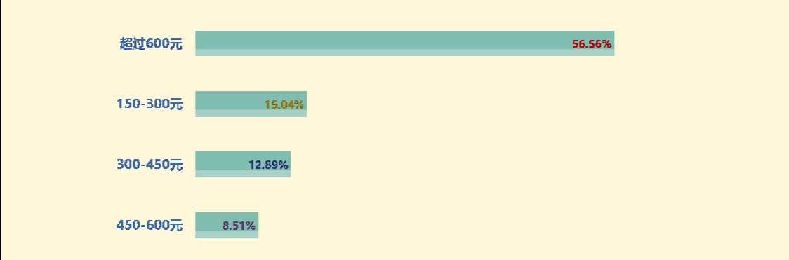 《報告》對在海南旅游的游客選擇酒店的消費水平調(diào)查顯示,選擇超過600元每晚的比例最高,占比56.56%;選擇450——600元每晚的比例有8.51%,兩者相加占比超過65%;150-300元每晚占比15.04%;300-450元,占比12.89%。