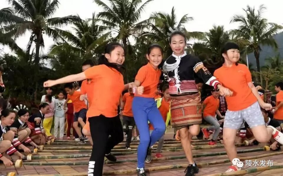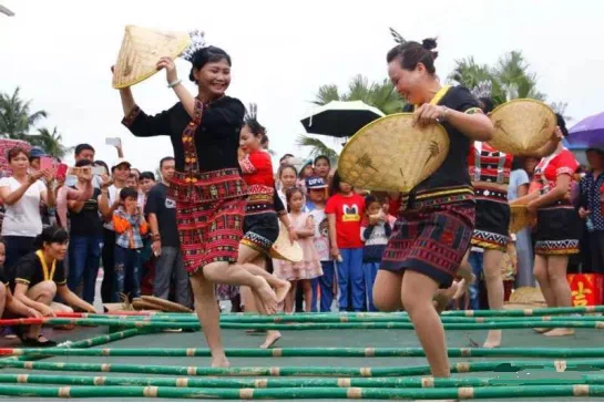 陵水小妹村的黎族婦女和游客一同跳竹竿舞