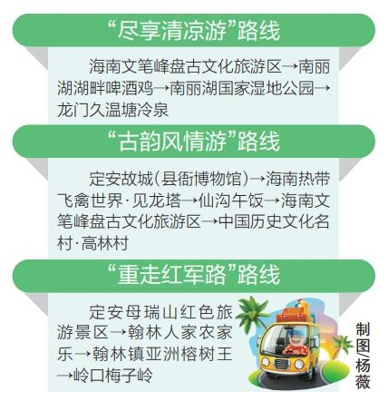以本土“綠色”“灰色”“紅色”的三色旅游資源為主,定安今年將推出盡享清涼游、古韻風情游和重走紅軍路三條路線。國慶中秋假期,定安還將推出多類文旅活動。從9月30日開始至10月8日,熱氣球空中體驗活動將在南麗湖國家濕地公園舉行,游客既可以在現場觀賞空中飛行表演,還可以參與體驗。此外,定安還將舉辦兒童平衡車競速賽、九人排球賽等一系列文旅活動,讓游客這個假期在定安玩得盡興、玩得痛快。