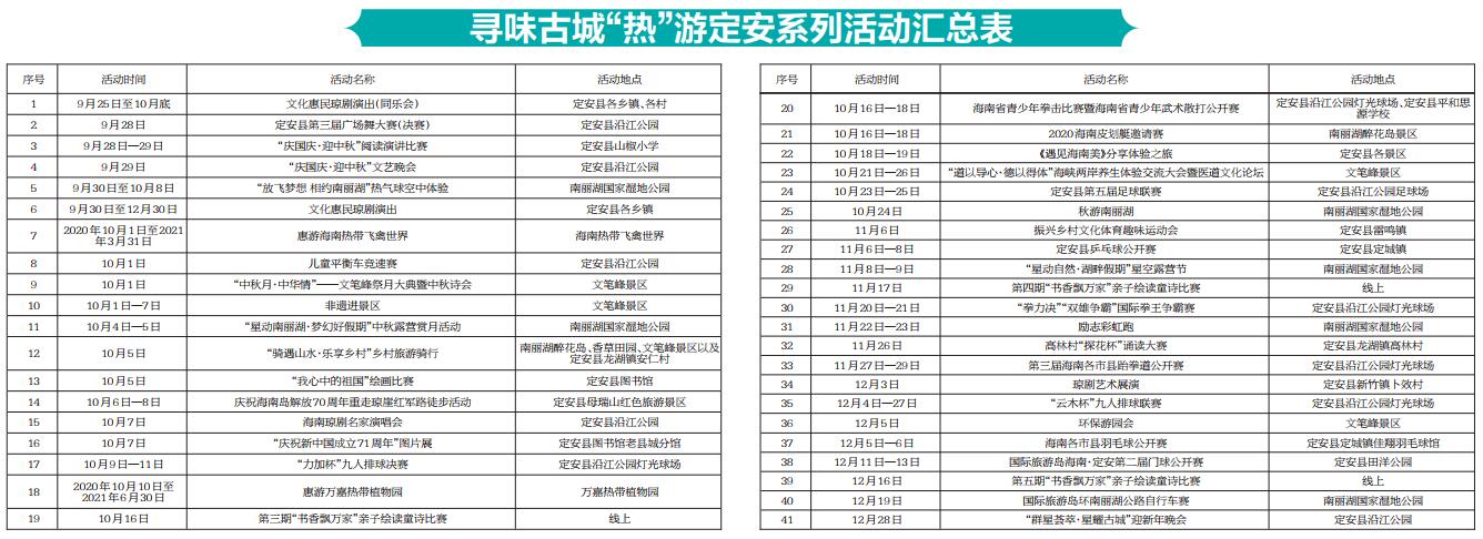 這些活動中,既有足球聯賽、皮劃艇邀請賽、乒乓球公開賽、國際拳王爭霸賽等體育活動,也有邀請游客分享定安美食美景、勵志彩虹跑、環保游園會、瓊劇名家演唱會等,屆時歡迎各地游客到定安體驗。