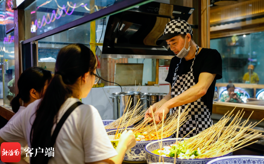 木桶魚、胖婆婆炸炸、雪里藏真椰奶清補(bǔ)涼、特色燒烤......走在夜市里,來自四面八方的美食香氣一股腦鉆進(jìn)鼻腔里,味蕾食欲瞬間被打開,令人口舌生津。“這里每家店都很有特色,環(huán)境優(yōu)雅,很有??跒I海城市特色?!眮碜愿=ǖ挠慰屠钕壬扑]了夜市的烤生蠔與海鮮粥,“味道特別好,價(jià)格也很實(shí)惠,值得多來吃吃逛逛。”