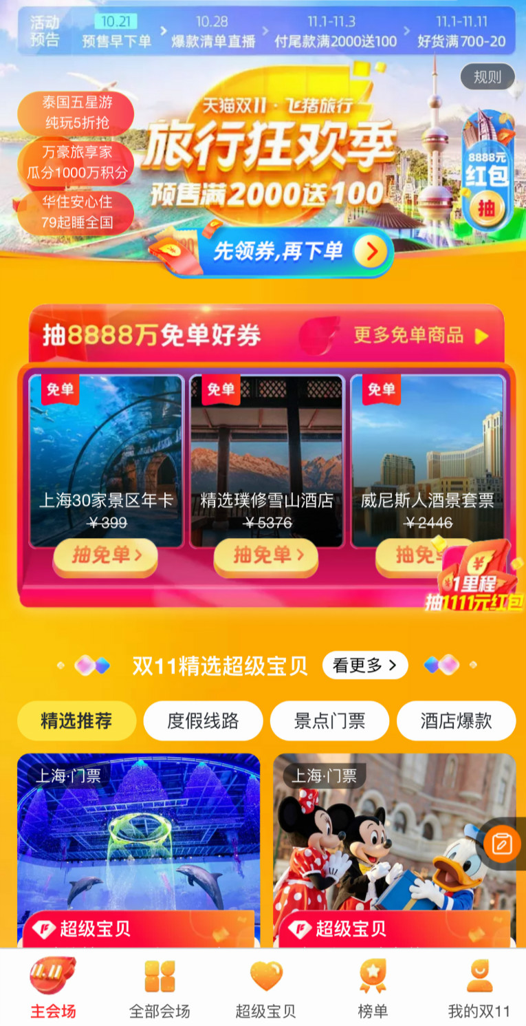 據了解,全球旅行大牌集結飛豬發新品,已經成了歷年天貓雙11的必備節目。今年天貓雙11期間,萬豪國際、海南航空、希爾頓、上海迪士尼、長隆等旅行大牌將輪番登陸飛豬超級品牌日,帶來超過400款專為雙11量身定制的獨家新品。