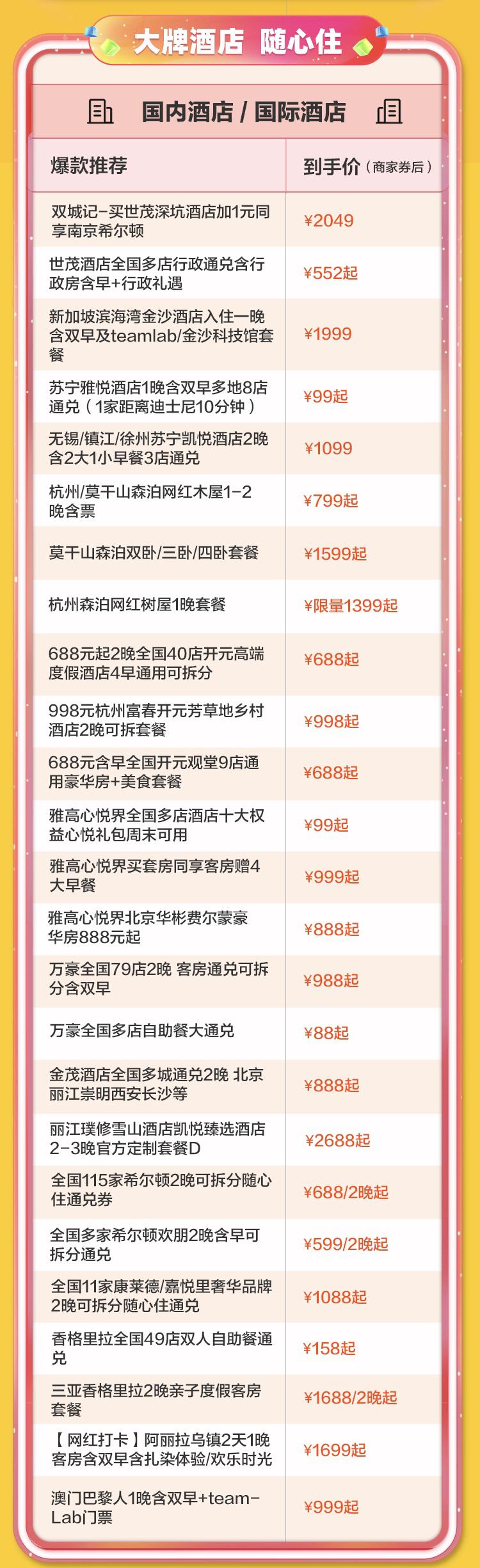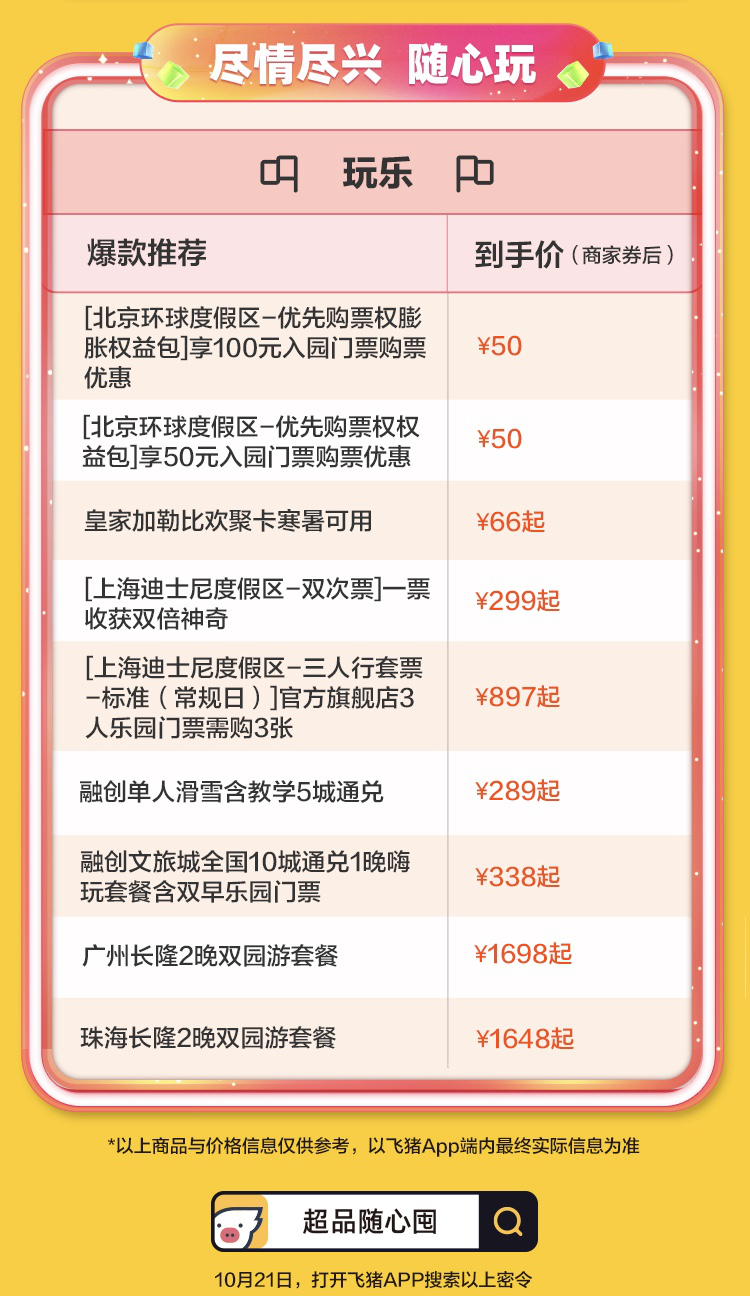 雙11便宜不能少。飛豬“隨心住”“隨心玩”,讓品質旅行好玩不貴。全國超13萬家酒店低至5折,花不到100元就能住上知名連鎖,五星酒店萬豪全國“隨心住”每晚僅需不到500元。想看上海杭州的四季風光,只花399元就能把全城必去景點刷個遍,一舉贏下朋友圈。最應景的冬季旅游剛需東北雪場和海南陽光沙灘,飛豬也全幫大家都想到了,更有自貿港免稅店折扣。